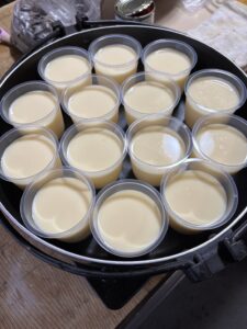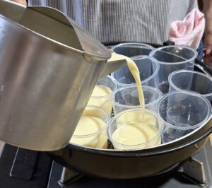⑪ プリンカップを少し傾け、プリン液が流れそうで流れなくなれば、できあがりです。