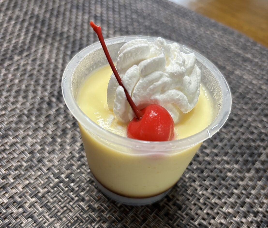 今回は、缶詰のさくらんぼを飾りましたが、いろんな種類の果物を使って「プリンアラモード」とか「プリンパフェ」なんていいですね。