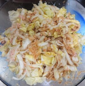 ① きゃべつを耐熱ボールに入れ、ふんわりとラップをかけ、500W5分レンチンし、しんなりさせます。