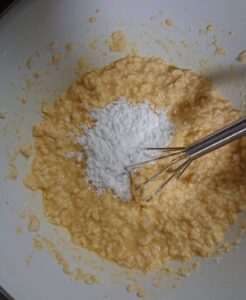 ② 水切りした豆腐を泡だて器でザックリと潰し、たまごを混ぜ合わせます。