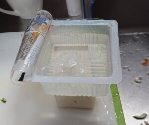 ① 豆腐は、上に重しをのせ水切りします。