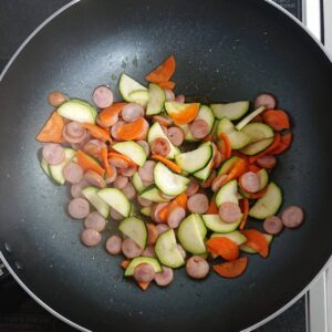 まず、ウインナーを炒め、ウインナーから出てきた油でズッキーニとにんじんを炒めます。