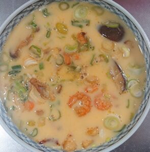 ⑨ 器に具材とたまご液を入れます。