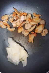 ④ とり皮は1口大に切り、フライパンで焼きます。