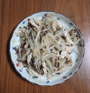 ④ 大根、しめじ、とりむね肉を混ぜ合わせ、エキストラバージンオリーブオイルと減塩塩昆布で調味して、できあがりです。